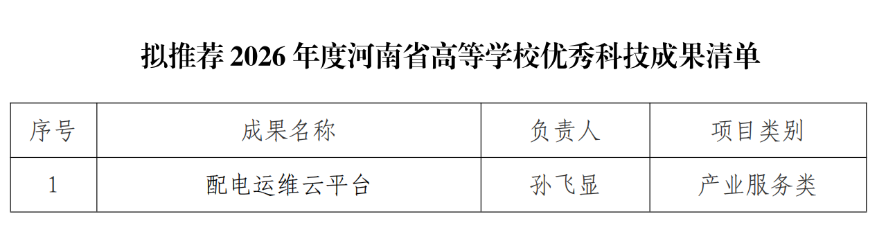 按照《河南省教育厅办公室关于开展2026年度河南省高等学校优秀科技成果评定暨河南省科学技术奖提名工作的通知》(教办科技〔2026〕92号)要求,科技开发处组织开展了河南省教育厅2026年度科技成果奖申报工作,截止4月7日16点,共收到1项成果的申报材料。现将符合申报要求的拟推荐成果进行公示,详见附件。公示期为3天(2026年4月7日至4月9日)。